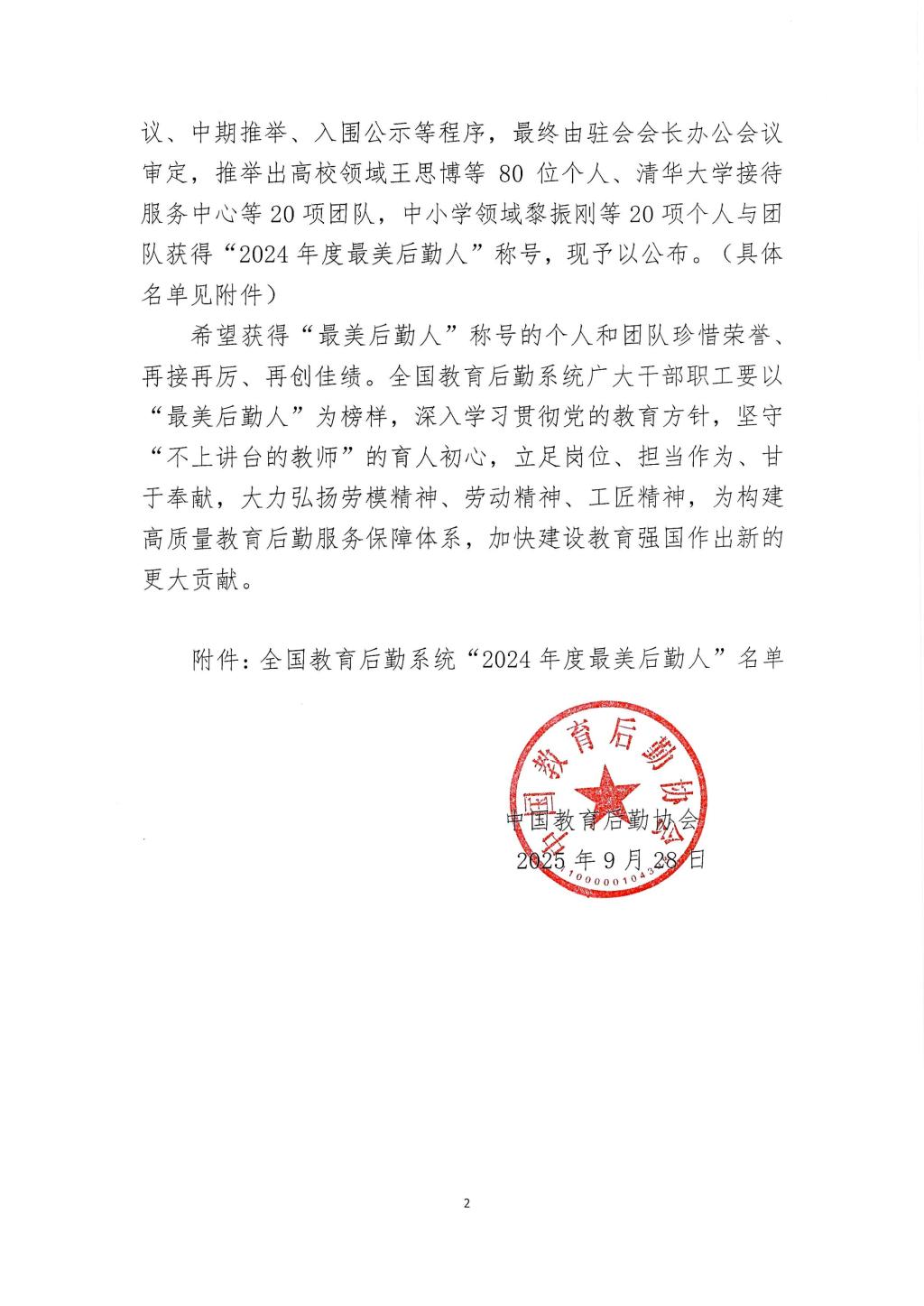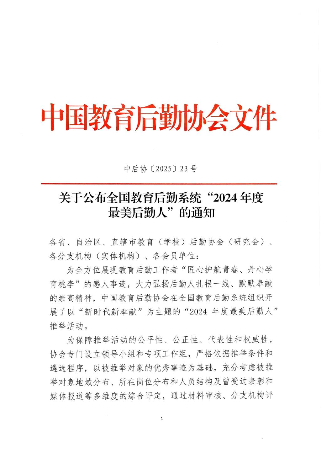 全国教育系统“2024年度最美后勤人”是中国教育后勤协会在全国教育后勤系统组织开展的以“新时代新奉献”为主题的推举评奖活动,是全国教育后勤系统的最高奖项。自活动开展以来,共收到来自全国29个省、自治区、直辖市的335项个人、171项团队申报信息。经材料审核、分支机构评议、中期推举等多轮审议,最终推举出高校领域的60项个人和40项团队入围“2024年度最美后勤人”。