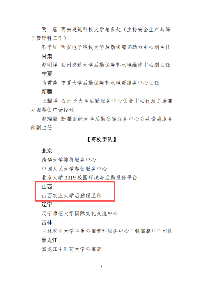9月28日,中国教育后勤协会印发通知,公布全国教育后勤系统“2024年度最美后勤人”入选名单,山西农业大学后勤保卫部入选,是本次评选中我省高校唯一获得团队奖的后勤部门,全国有清华大学、中国人民大学、北京大学等高校的40个后勤团队获此殊荣。