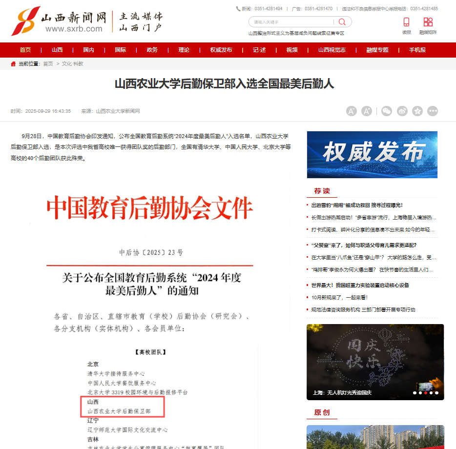10月16日,全国教育后勤系统“2024 年度最美后勤人”荣誉授予仪式在北京举行,山西农业大学后勤保卫部获得殊荣,是本次评选中山西省高校唯一获得团队奖的后勤部门。
