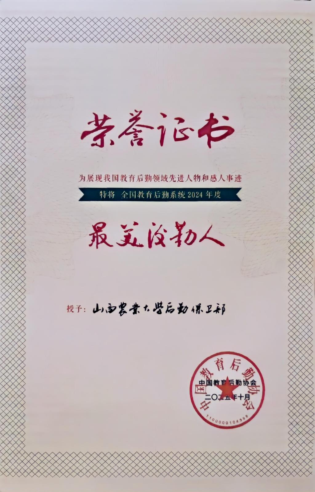 荣誉是过去的勋章,更是未来的起点。在新时代的征程上,唯有以“归零心态”珍惜荣誉,以“奋进姿态”砥砺前行,方能续写更加辉煌的篇章。山西农业大学后勤人将以此为新起点,以更加昂扬的姿态,更加奋进的力量,为校(院)事业高质量发展赋能更高品质的保障支撑。