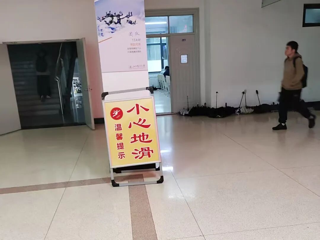 物业管理中心工作人员在楼宇门前铺设防滑垫、放置“小心地滑”警示牌,及时组织力量清理地下室渗漏雨水、屋顶雨水,提高了公共区域的保洁频率,确保师生在楼内有一个干爽、清洁、安全的环境。