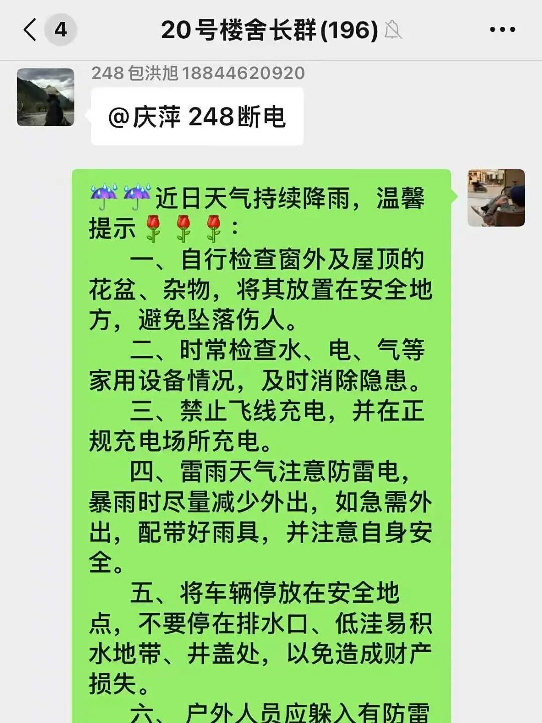 公寓管理中心的工作人员化身“贴心家人”,及时在公寓群内发布安全提醒,关心学生需求,他们细致检查各楼层走廊窗户,为同学们整理散落的雨伞,确保同学们在风雨天里依然能感受到家的温暖。