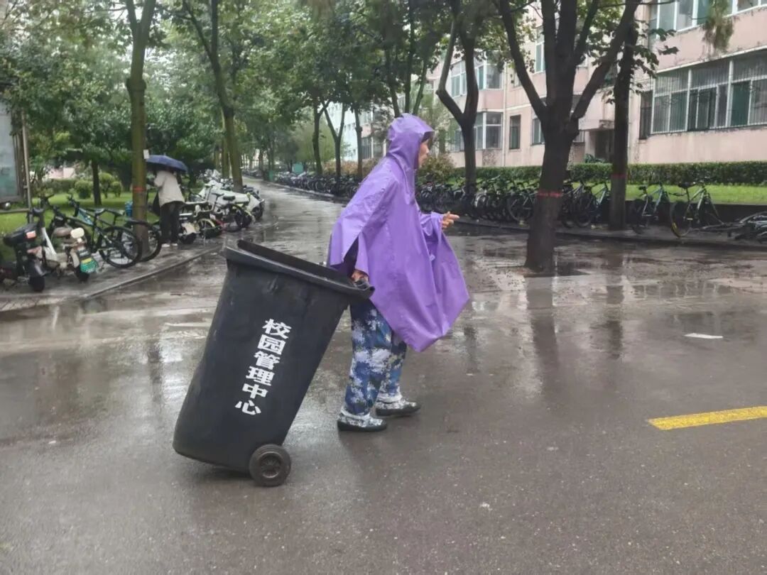 校园管理中心工作人员冒雨巡查,做好立交桥防洪排水工作,及时清理被风雨刮断的树枝,加强校园垃圾清运频次,全力维护校园环境的整洁与美丽。
