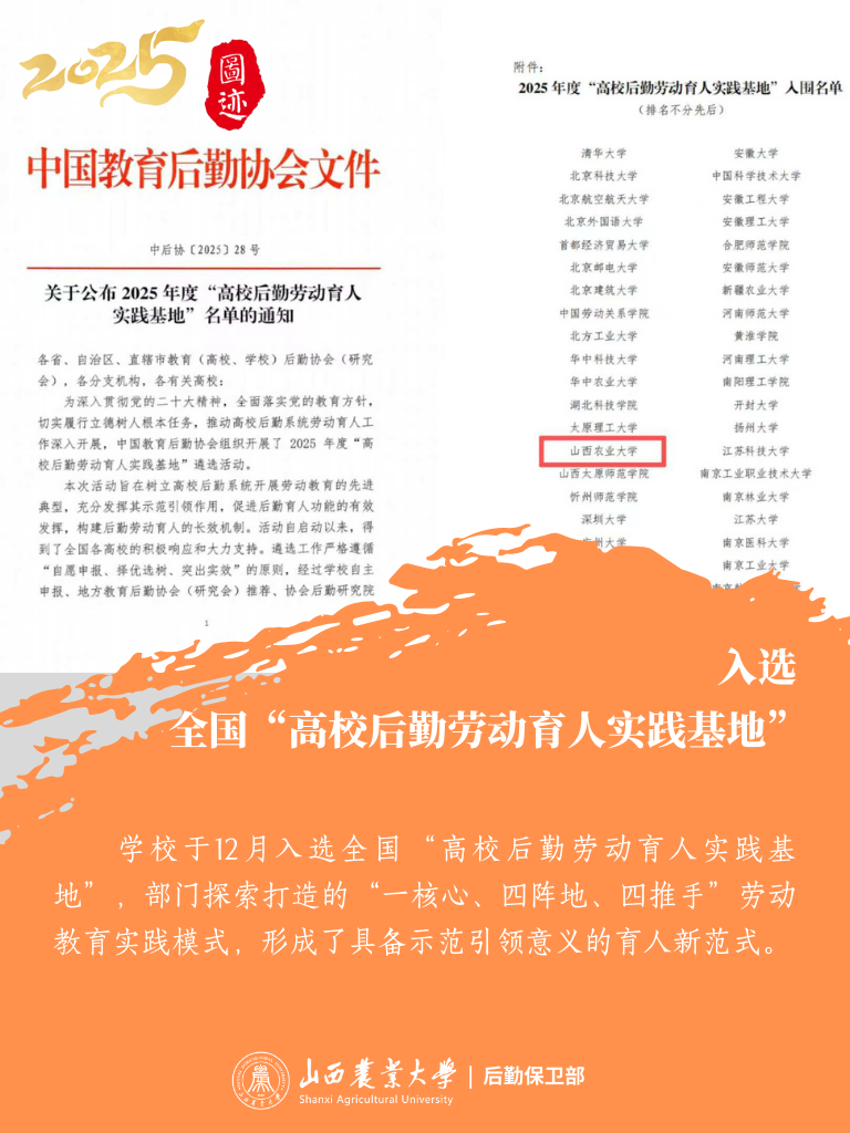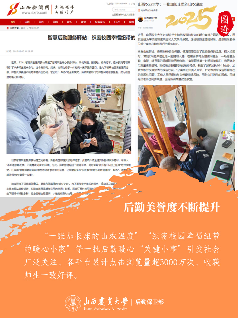 2025年的时间卷轴终于来到最后,回眸这一年,农大后勤人用奋斗作笔,以实绩交出2025年高质量发展答卷。现在,让我们放慢脚步,用25图回顾SXAU后勤保卫部2025途迹。