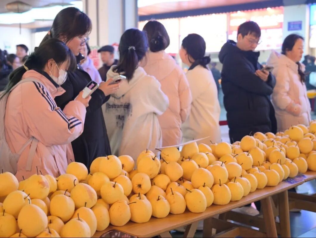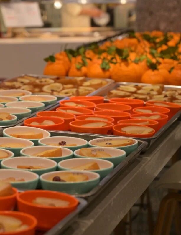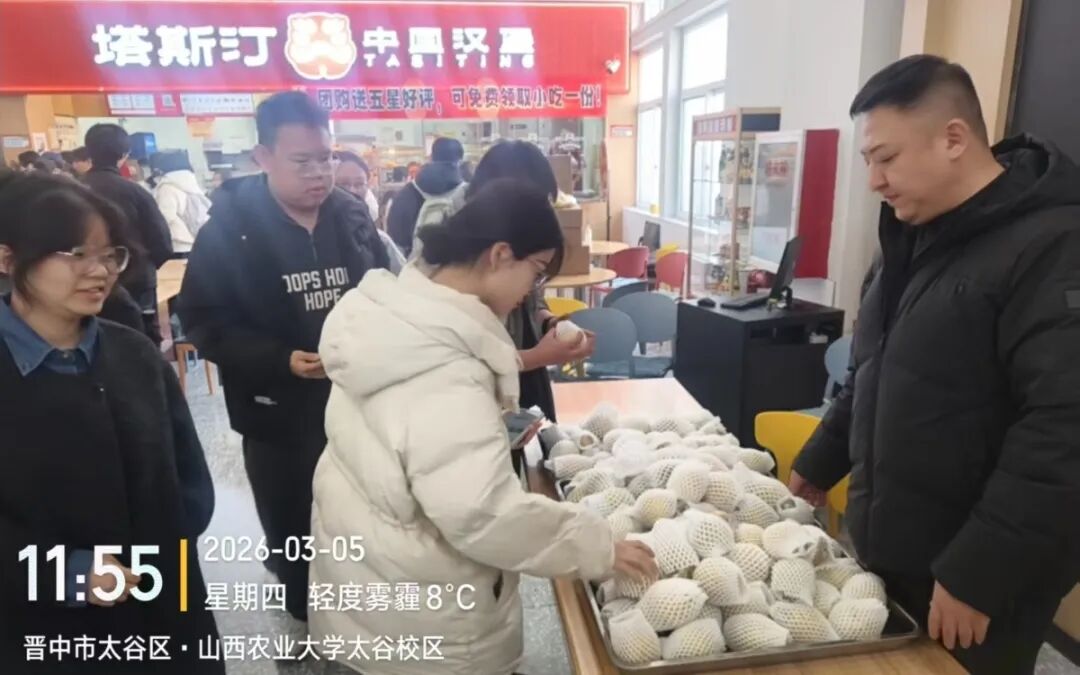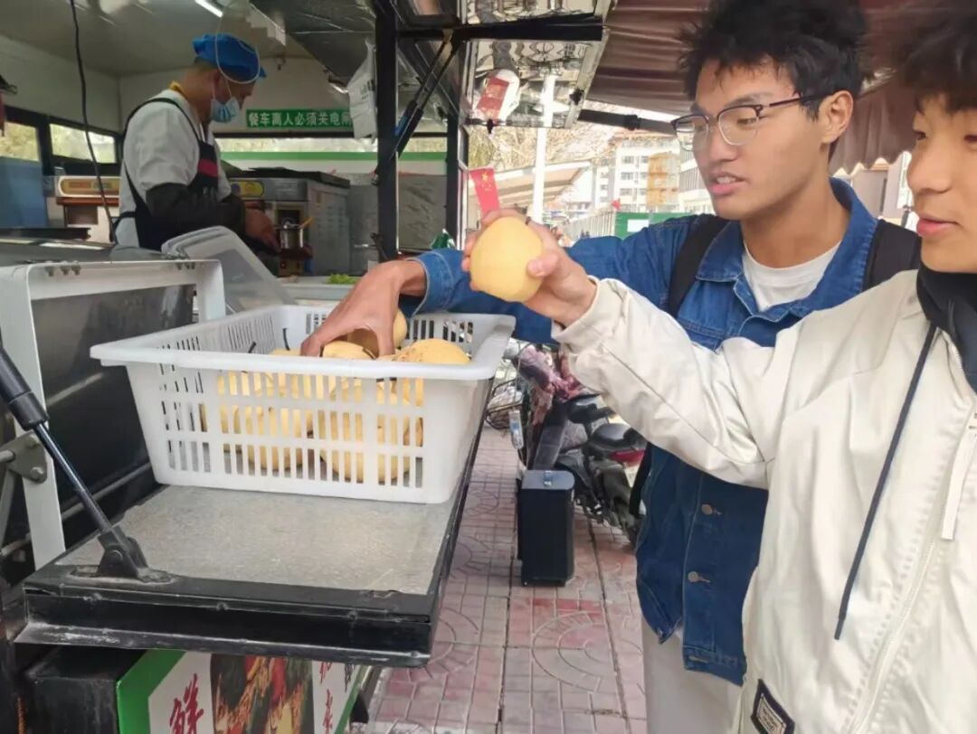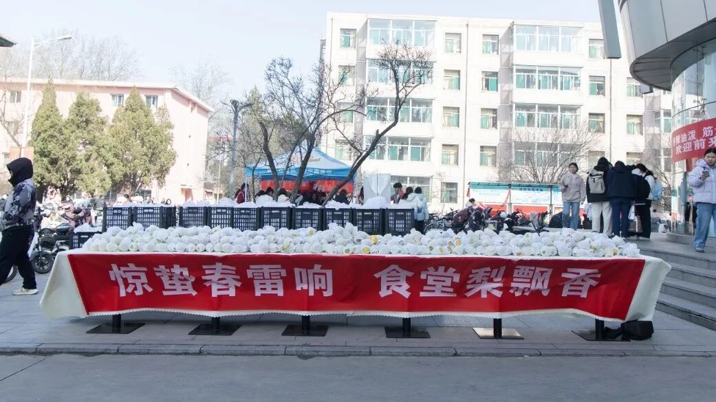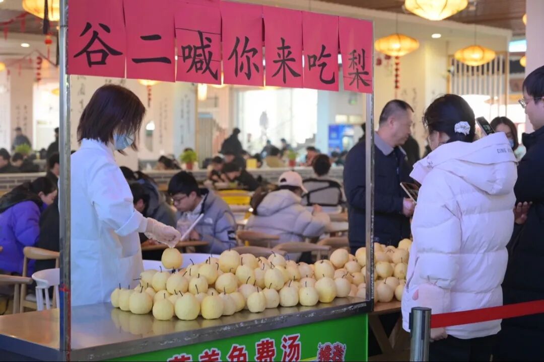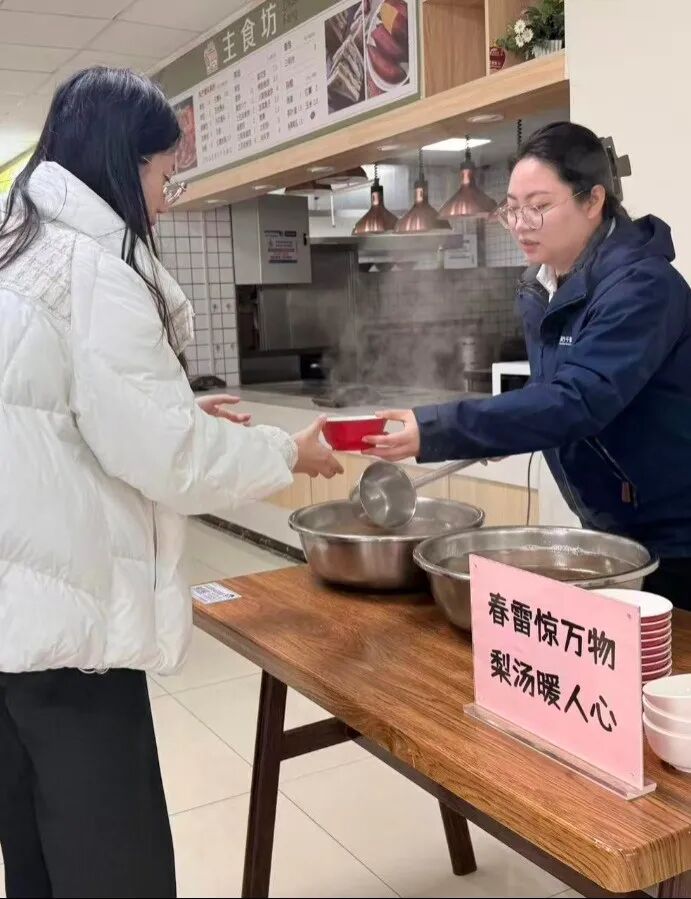 “同学,来,拿一个梨,惊蛰快乐!”工作人员热情地招呼着每一位经过的同学。一个个黄澄澄的梨,经过严格筛选,确保新鲜饱满、口感上乘,传递到同学们手中。餐厅里,一锅锅温润的梨汤咕嘟咕嘟地冒着热气,清甜的香气弥漫在整个就餐区。