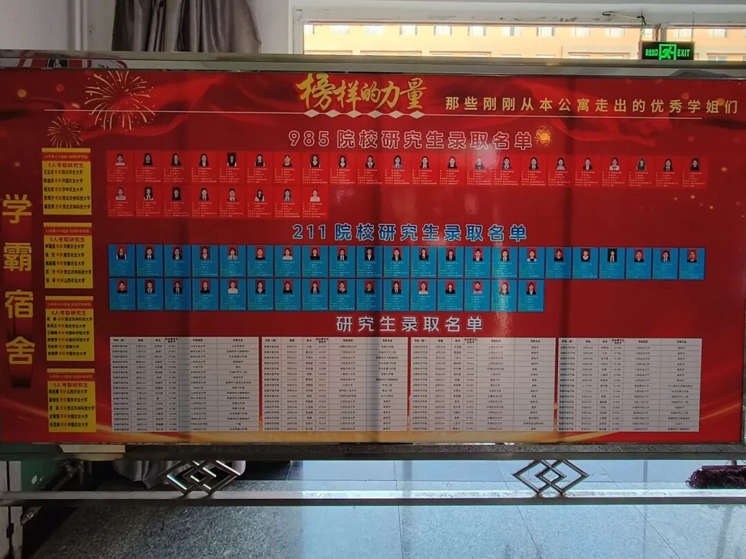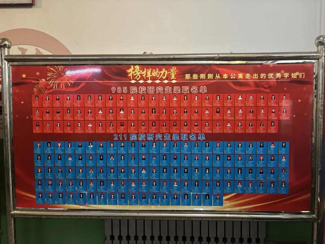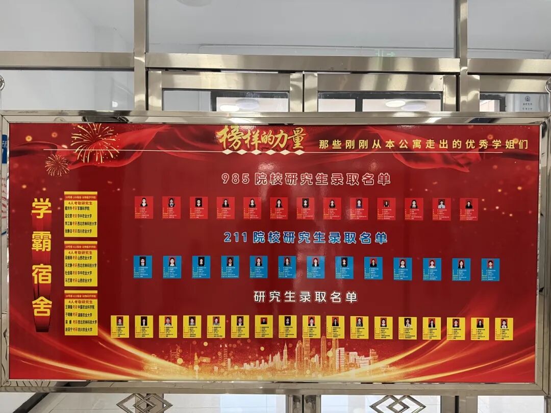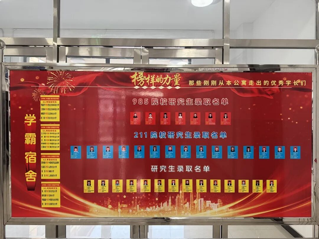 近日,为进一步打造公寓育人文化阵地,发挥朋辈引领示范作用,提升后勤环境育人水平,后勤保卫部公寓管理中心分类梳理2025届毕业生考研情况,制作“榜样的力量”系列展板,分别对应在11号、15号等8栋新生公寓楼大厅展出。展板内容为各公寓各宿舍2025届毕业生考研学生被录取的学校及专业,还特别整理了“学霸宿舍”名单,在润物无声、潜移默化中培养学生的看齐意识和进取精神。以此激励新生以刚刚从自己所在公寓、宿舍走出的优秀学长学姐为榜样,从大一开始就树立勤奋学习,勇攀高峰的远大志向。展板一经展出,便吸引了众多新生驻足观看。