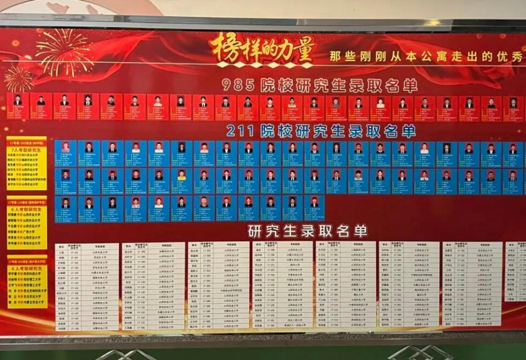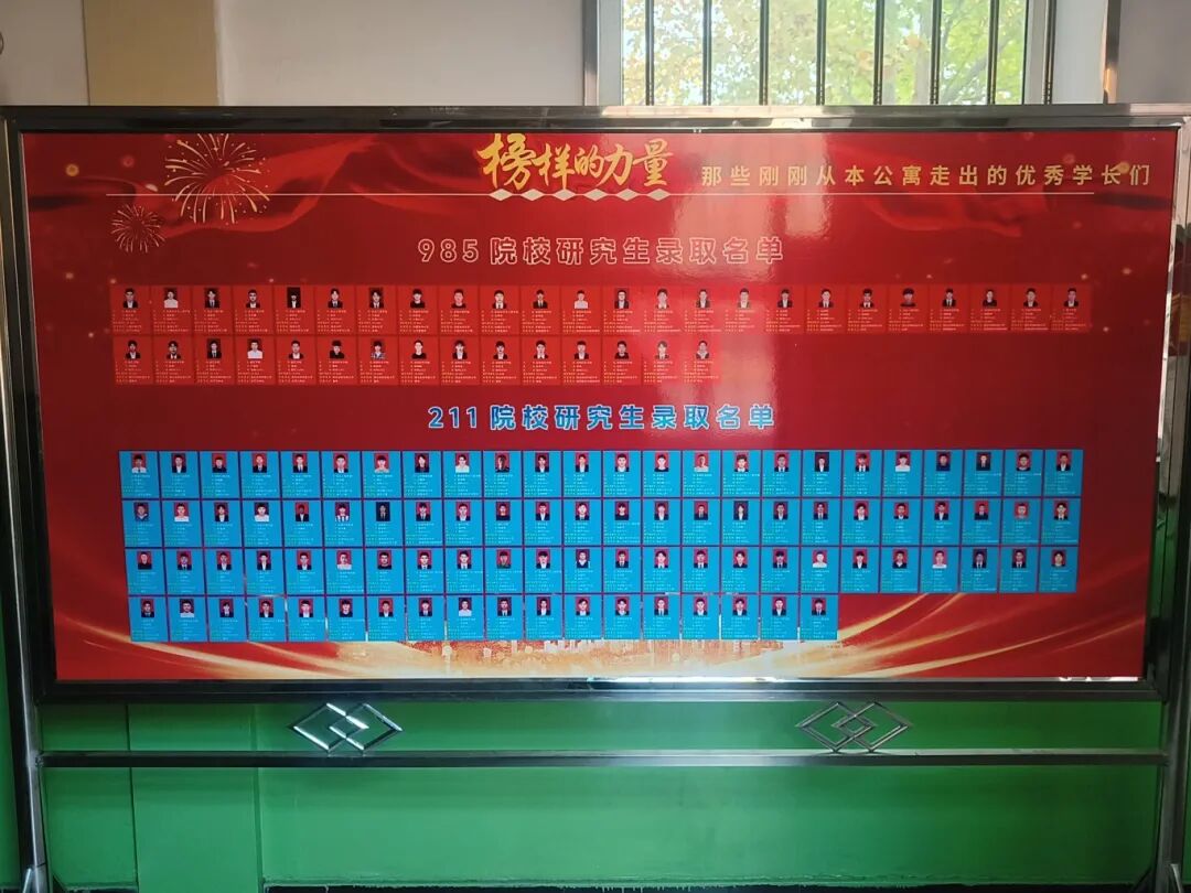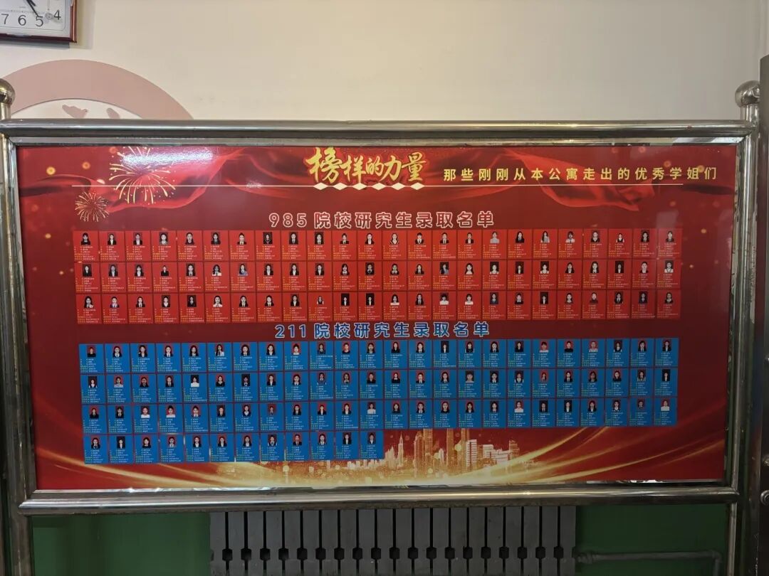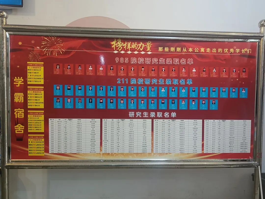 近日,为进一步打造公寓育人文化阵地,发挥朋辈引领示范作用,提升后勤环境育人水平,后勤保卫部公寓管理中心分类梳理2025届毕业生考研情况,制作“榜样的力量”系列展板,分别对应在11号、15号等8栋新生公寓楼大厅展出。展板内容为各公寓各宿舍2025届毕业生考研学生被录取的学校及专业,还特别整理了“学霸宿舍”名单,在润物无声、潜移默化中培养学生的看齐意识和进取精神。以此激励新生以刚刚从自己所在公寓、宿舍走出的优秀学长学姐为榜样,从大一开始就树立勤奋学习,勇攀高峰的远大志向。展板一经展出,便吸引了众多新生驻足观看。